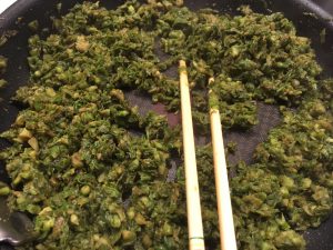色がかわりやすいので手際よく刻んでいきましょう。なぜなら、、、、 ふきのとうはアクが強いので切ったらすぐに炒めなければならないからです。