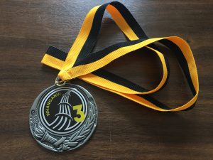 メダルをもらいバナナを頬張りながら体のストレッチを入念にします。